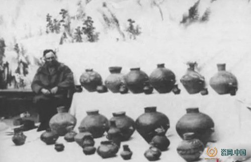 1923年春天安特生考查队到达甘肃兰州,偶尔从地货摊上发现了一个装着烟叶的旧彩陶罐,并购买了一批出自洮河流域以半山、马厂类型为主的彩陶(图三:安特生在兰州购获彩陶),并把这批彩陶相继写入了他的考古报告。1924年,终于在甘肃省临洮县洮河西岸的马家窑村麻峪沟口,首先发现史前文化遗址并试掘,命名为“马家窑文化”。