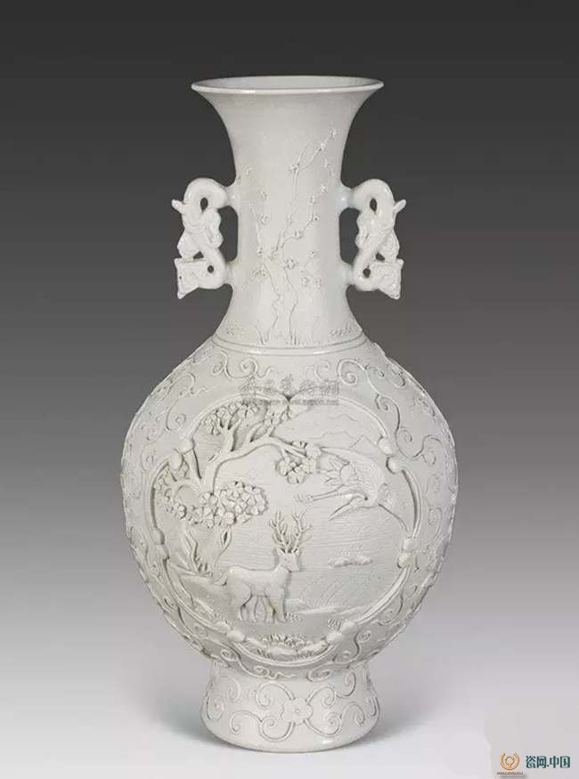清 王炳荣雕瓷鹤鹿同春纹龙耳瓶