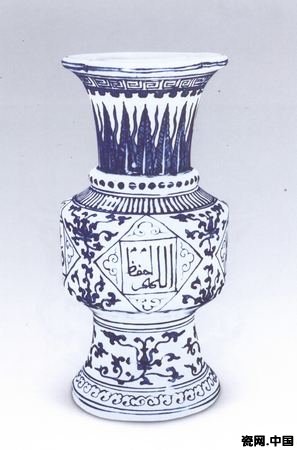 明正德青花仰钟式碗,北京故宫博物院收藏。外壁以缠枝花衬托阿拉伯文,译为“争取安逸,丢掉烦恼”。碗心书阿拉伯文,译为“善的报酬能不是善吗?”底部书“大明正德年制”楷书款。
