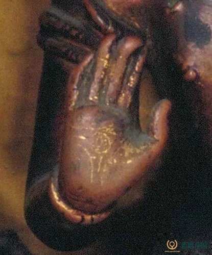 椭圆形的仰覆莲座,莲瓣肥大,深束腰。此像头部的色彩是在西藏流传中涂饰的,按西藏习俗经常为佛贴金敷彩可以修功德。