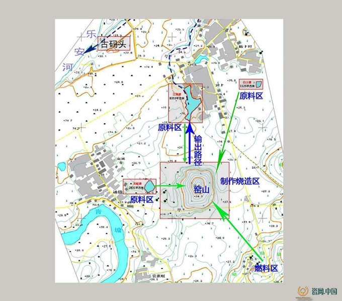 在以窑山为中心的3平方公里范围内,发现了与瓷器烧制活动有关的燃料、原料、交通运输体系等遗迹。窑山东南部的整片丘陵,是当时南窑窑业的主燃料区;窑山北边、西面仅几百米处的3口总面积达8000多平方米的池塘,塘底发现了灰白色或黄白色的瓷泥,这是南窑的原料区;乐安河东岸一处叫畈上屋的地方发现了古码头,从古码头溯一条名叫溪坑的小溪而上直线800米可抵达窑山,这是当时南窑窑场往外运输瓷器、往内运原材料和生活必需品的通道。