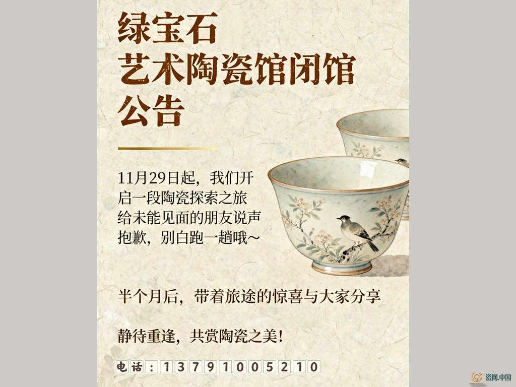 因闭馆给大家造成的不便,敬请谅解。半个月后,我们将满载旅途的惊喜与收获归来,带着更丰富的艺术视角、更优质的原创作品,与大家重逢于绿宝石艺术陶瓷馆,共赴一场陶瓷美学盛宴。